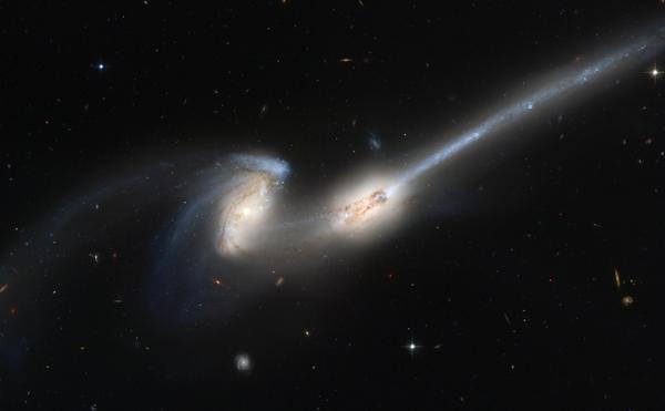 Die ''Mäuse'' sind ein weiteres spektakuläres Beispiel für miteinander wechselwirkende Galaxien. Vermutlich werden diese zwei Galaxien innerhalb von weniger als 109 a zu einer einzigen verschmelzen. (Bild: HST)